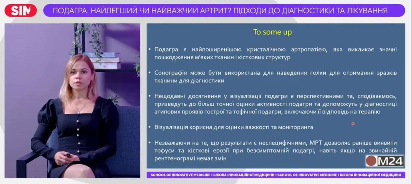 Школа інноваційної медицини організувала майстер-клас «Подагра. Найлегший чи найважчий артрит? Підходи до діагностики та лікування». Спікер М24 Літинська Юлія Миколаївна виступила з доповіддю «Мультимодальний підхід в діагностиці подагри».